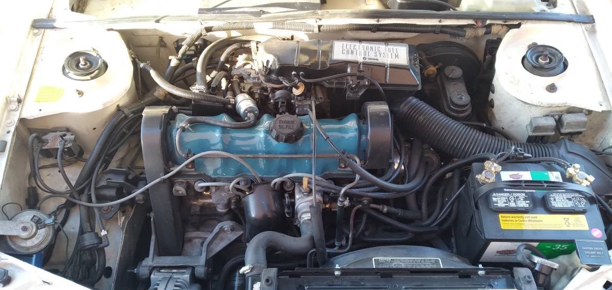 Engine is black, I painted the Valve cover Chrysler blue when I changed the gasket since the cork was leaking. 87 was the last year for carbureted, they went to TBI for base Omnis in 88. Everything in the engine bay is original to this car. Believe me I wish I could junk alot of the emission components and sorry excuse of a carburetor and make it more peppy but good old CA emission testing…
