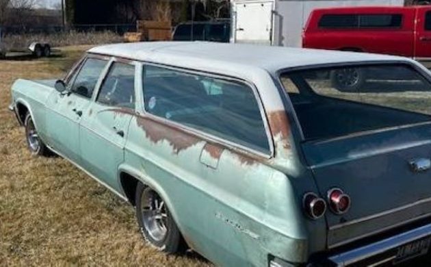 Chevrolet had a banner year in ’65, selling a total of almost 2.5M cars. Their full-size line (B-body) was responsible for about 1.6 M of that total, with a station wagon count registering 184K units. The big car’s complete redesign for ’65 was just perfect, at least in the eyes of many auto buyers. Trim levels started the model year with the Impala on top, the Bel Air in the middle, and the Biscayne trailing along in the caboose position. Early February saw the introduction of the top dog Caprice, but no station wagon variant was available until ’66. Our subject car is finished in Artesian Turquoise, a very popular ’65 hue, and is topped off with a white roof. The body is straight, but the paint is damaged, there is rust in places, and some of the stainless trim has gone missing – cosmetics are this car’s biggest issue. The only exterior suprise are the magnum-style steel wheels, which were featured as standard equipment on the ’69 and ’70 Chevelle SS.