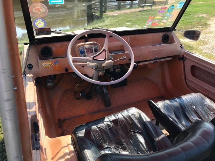 If you bought this truck would you keep the plastic flamingo strapped to the grille? Perhaps it’s a bit tacky but I think it fits perfectly! This vehicle has beach vacation written all over it and how fun would it be to own one of these and cruise around in places like Cape Cod or the Outer Banks? Originally orange, the body shows the effect 47 years of exposure can have on plastic despite this truck being garage-stored, according to the seller. The fading is obvious but more importantly, how brittle is the plastic? Half-century-old plastic certainly isn’t going to help this truck win any IIHS Top Safety Awards and even a minor collision could be catastrophic. The seller doesn’t provide photos of the metal frame but claims there is “very little rust anywhere, only surface rust.” The original door panels will be provided with the sale as well as the original canvas top, although “rotted out.” I do like the functional non-original bikini top and frame which fits nicely with the design of the truck.
