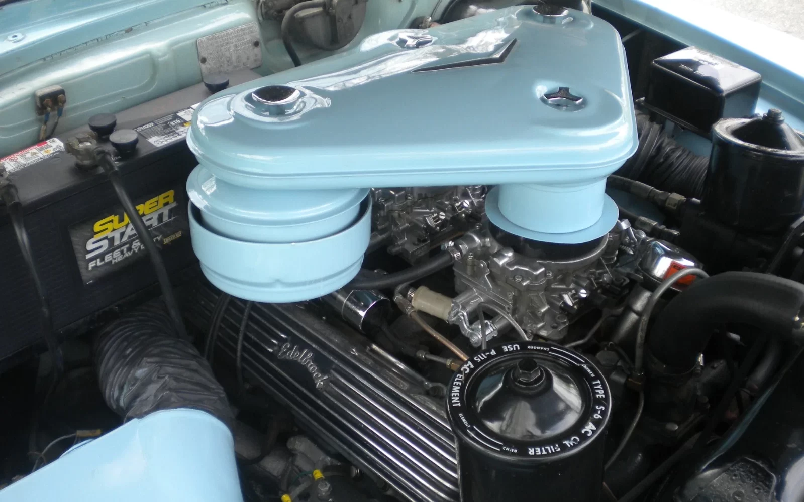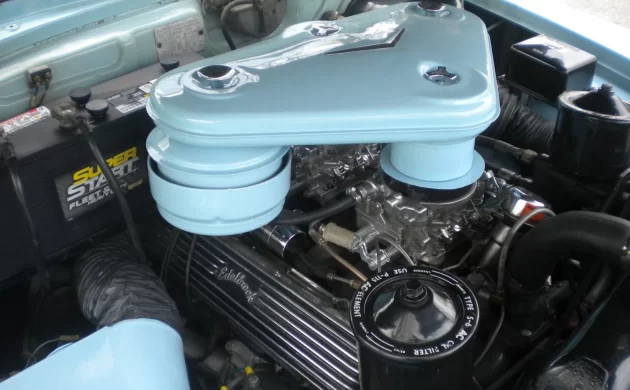 The mild-custom theme begins under the hood with a body-colored “Batwing” air cleaner from a later Cadillac feeding a dual-quad intake manifold, and the carburetors look like modern Edelbrock four-barrels. The engine also has neat finned Edelbrock valve covers. The car was painted seven years ago and has been stored ever since, so the seller, who is responsible for clearing the late owner’s estate, pulled the car out and got it running. He says it could probably use some tuning, but when it’s running well, it produces 210 horsepower from 331 cubic inches, and probably somewhat more than that, thanks to the hotter induction system.
