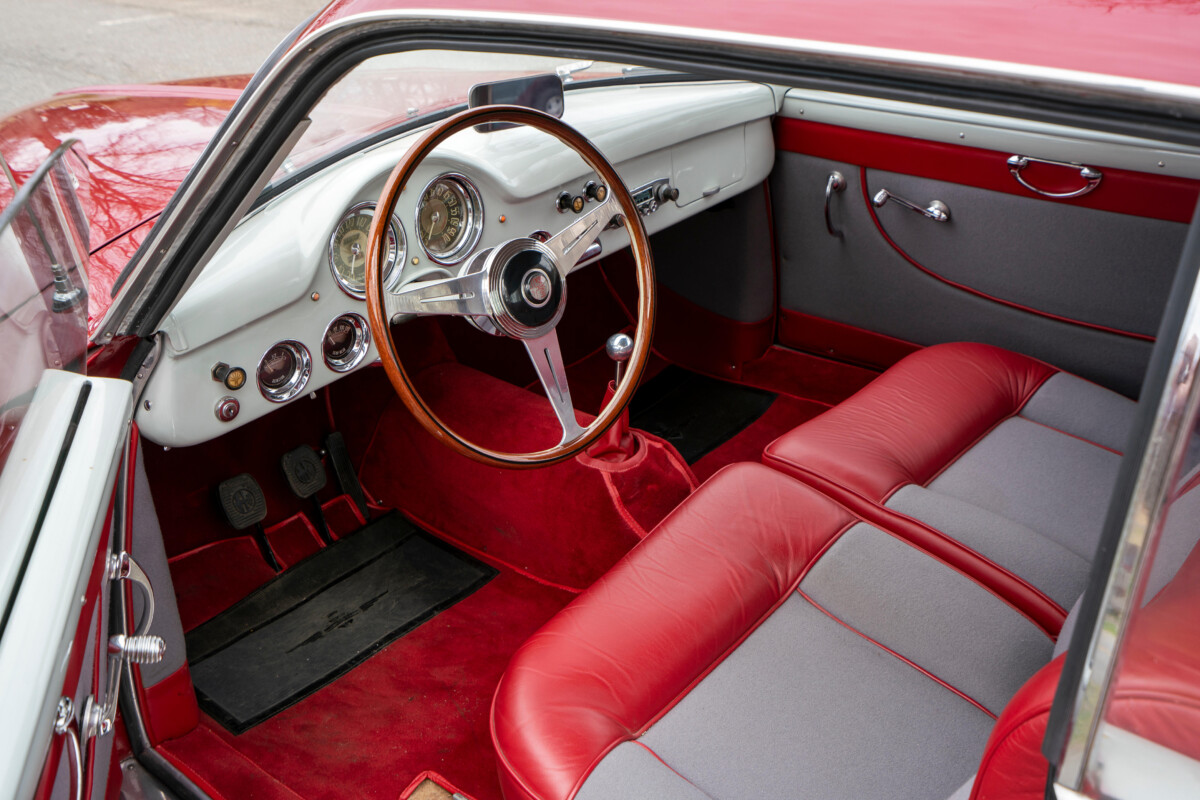 The interior is resplendent in red leather and grey broadcloth. A wood-rimmed three-spoke steering wheel, six Veglia gauges, and a period radio round out the driver’s office. Some tools, a knock-off hammer, and a jack come with the car. The alloy bodywork helps this Sprint reach a top speed of 115 mph. If there’s a complaint, it’s that the seating isn’t terribly supportive from side to side at higher speeds. I dunno, I’m guessing I could overlook that!