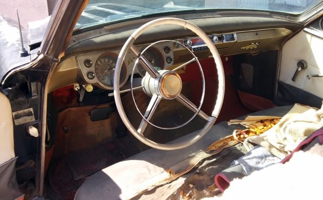 California and Nevada may be excellent locations for steel preservation, but the sun in those states can wreak havoc on interior trim. This President is no exception, although it isn’t as bad as some classics from the region previously featured at Barn Finds. The seatcovers are toast, the remaining upholstered surfaces exhibit deterioration, and the wheel is cracked. However, the dash and pad look surprisingly good, and there appear to be no missing items. The factory radio is intact, as is the clock.
