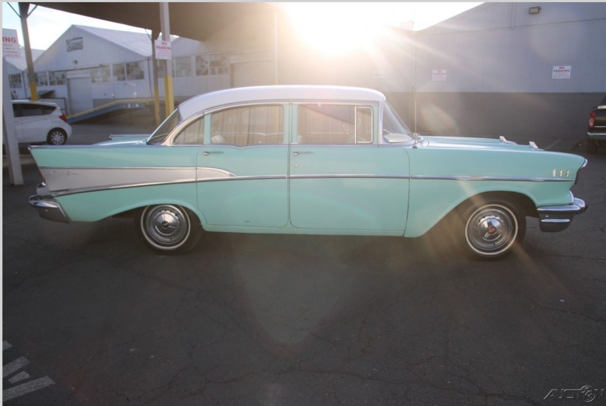 While in OKC in the ’80s we located a rust free ’57 4 door for friends in California that needed some bodywork, paint, and some mild interior work. White over dust pearl metallic with V8 and auto trans and a tube type garage door opener. The 90 year old lady original owner said it seemed her garage door was getting narrower and she needed a smaller car. It came out a beautiful car which they flew in and drove back to California to a life of cruises and car shows. This car fits that bill nicely.