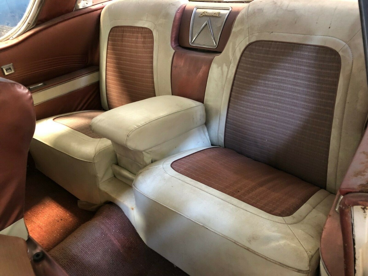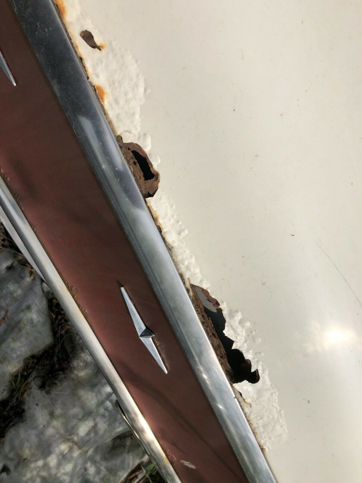 The Bonneville rolled off the production line finished in a combination of Patina Ivory and Redwood Copper. The vehicle is essentially quite straight, although it does sport a pretty sizeable dent in the passenger side front fender. There are also some rust issues, and some of these are showing in some slightly unusual places. There is some pretty nasty looking rust in the passenger side door (especially under the handle), along with some appearing from under the chrome molding on the driver’s side rear quarter panel. The floors look to be quite good, with the only real problem being some spots of rust in the floor on the driver’s side. The frame and trunk appear to be solid, but the trunk reinforcement is said to be quite rusty. There are also some trim pieces missing from the car’s exterior, along with the lenses from the tail-lights and backup lights.