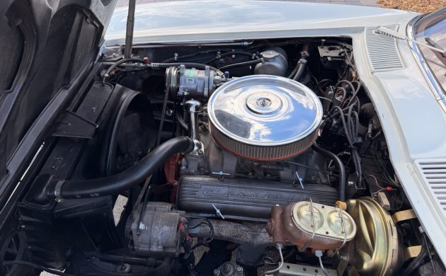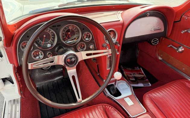 The theme of impressive presentation continues inside this Corvette. The driver’s-side kick panel appears to be missing its edge trim, and the bright trim on the glovebox door seems to sport some dents. However, those seem to be its worst defects. The Red vinyl trim looks spotless, there is no carpet wear, and the dash is excellent. There is no appreciable wheel wear, and the car retains its AM/FM radio. The seller indicates that the build included installing a Vintage Air A/C system, and the original shifter has been replaced by what appears to be a Hurst shifter.