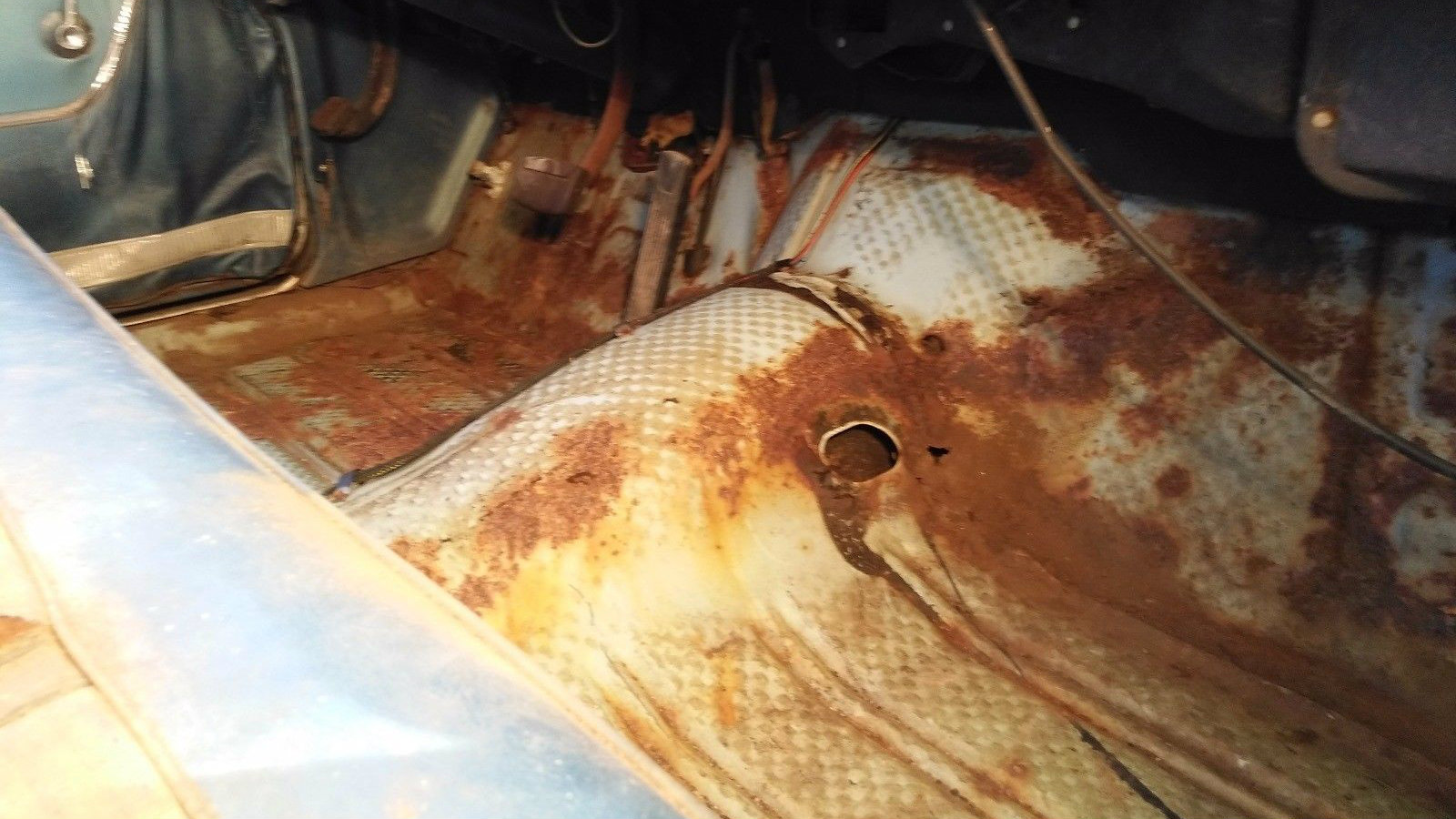 And, as you can see from this shot, the floor is pretty decent. I’m guessing the majority of this surface rust will clean off easily and some POR-15 or a similar product will keep it that way. I certainly wouldn’t be looking to replace any of it! What a pleasant surprise–an old, inexpensive classic that doesn’t need a new floor welded into place! Actually, the seller does state that there are “3-5 small” holes in the front floor pans, so some localized welding will be needed.