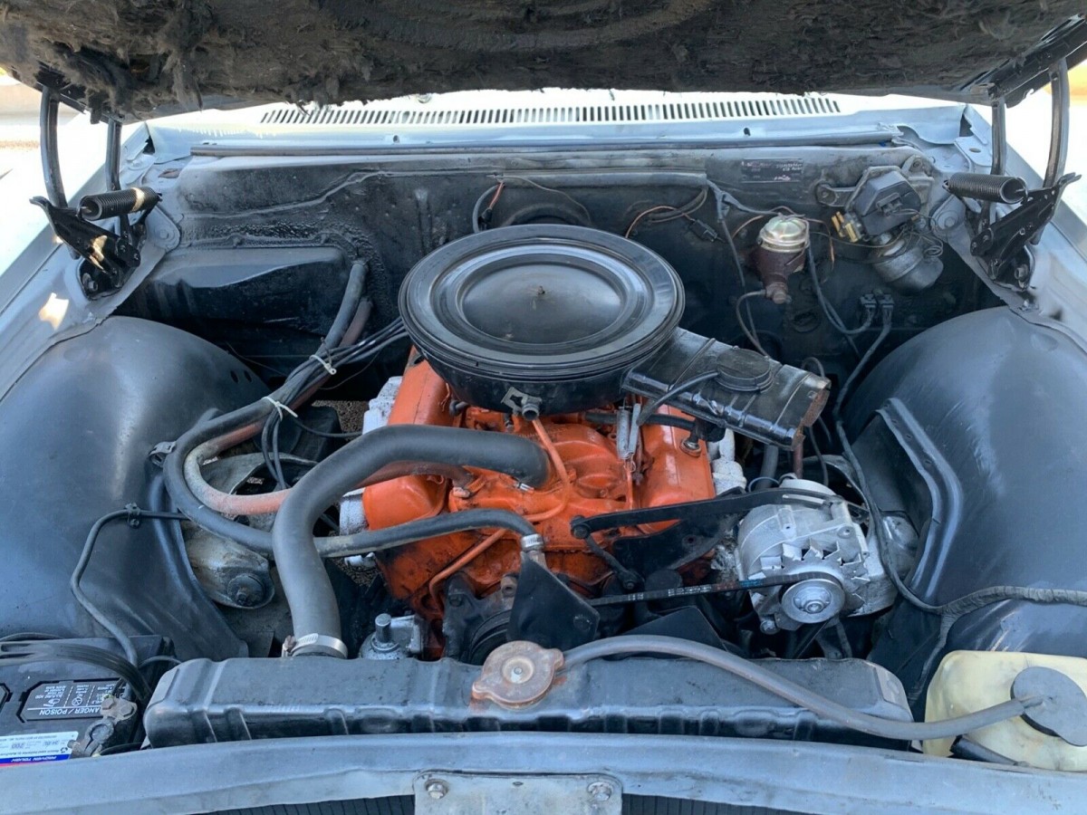 Engine block looks like late ’70s/ early ’80s, it appears to have the short pad on the passenger side above the water pump. The air cleaner is definitely late ’70s and up. No fan shroud. Looks like older heads- don’t see accessory holes on the front. I bet this car was a 6cyl originally, the v8 emblems aren’t located properly. No SS emblem on left front fender that i can see. I’m guessing pieced together.