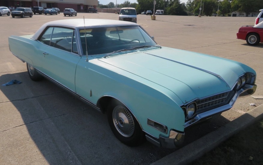 Among Oldsmobiles, the 98 occupied the top slot, always retaining its luxury connotation despite GM’s habitual gyration of its models from top to bottom of the pecking order. Sitting on a longer wheelbase than the mid-market 88, with fancier trim and a distinctive roofline, the 98 was also Oldsmobile’s technology leader. When new features arrived, such as the Autronic Eye, the 98 was frequently the first model to receive it. Its styling, with a “front fender fin” that nearly obscures the headlamps in the grille, is a more extreme version of the Buick Skylark. Here on eBay is a 1966 Olds 98 two-door hardtop in a no-reserve auction, currently located in Decatur, Illinois, but reputedly a California car. The starting bid is $4000; no one has stepped up yet. Let’s explore this car’s virtues and drawbacks.