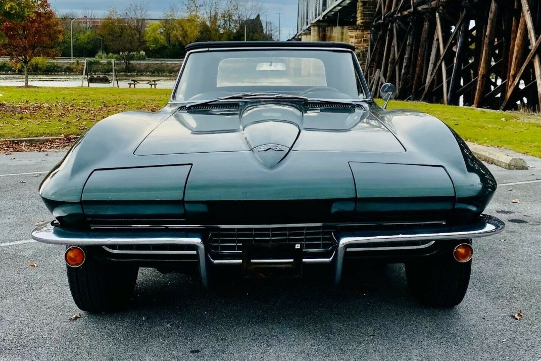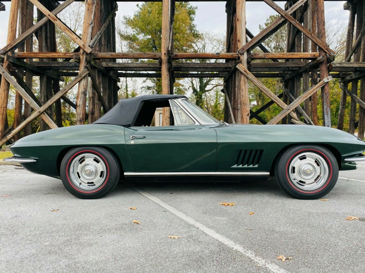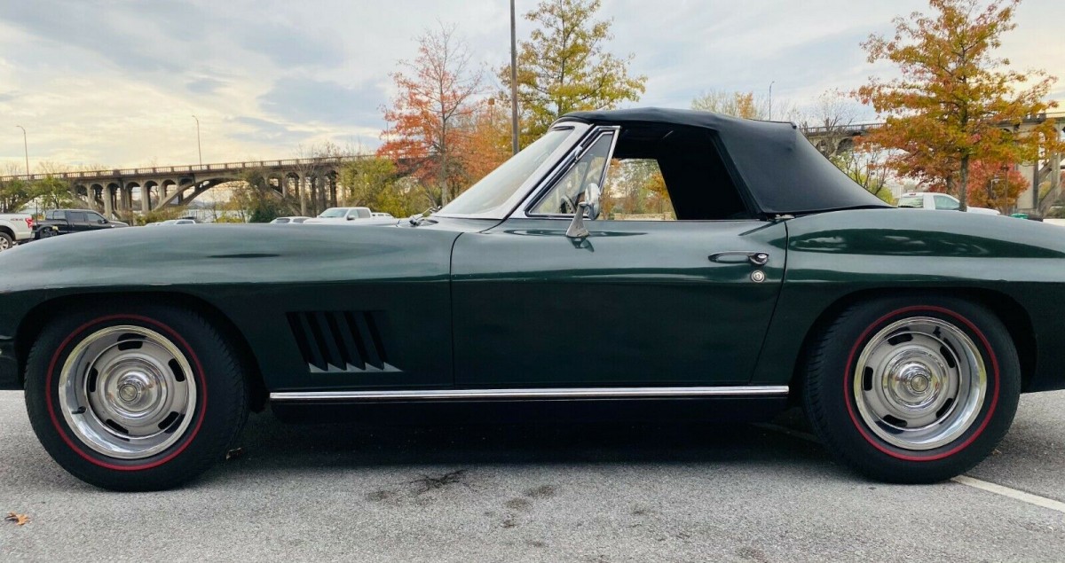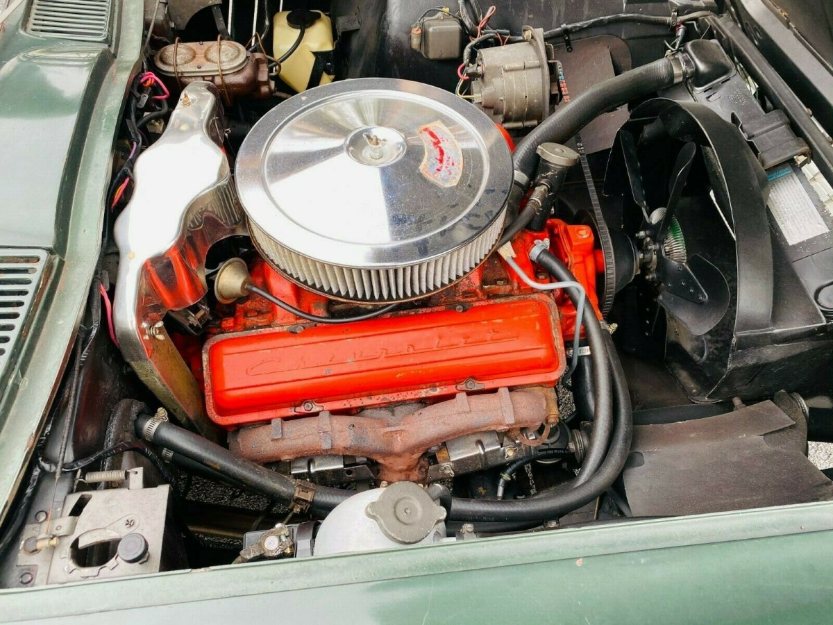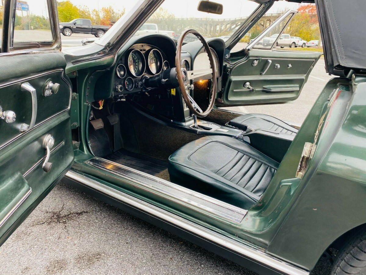 Best year for Corvette and the last year. I recall green and green was not a popular color in the 60’s. My 65 roadster was Maroon with silver leather 396 with side pipes. Heavy front end from the 396 with Mack truck steering. The only think that car did was rumble and go fast in a straight line. The handling and brakes sucked.