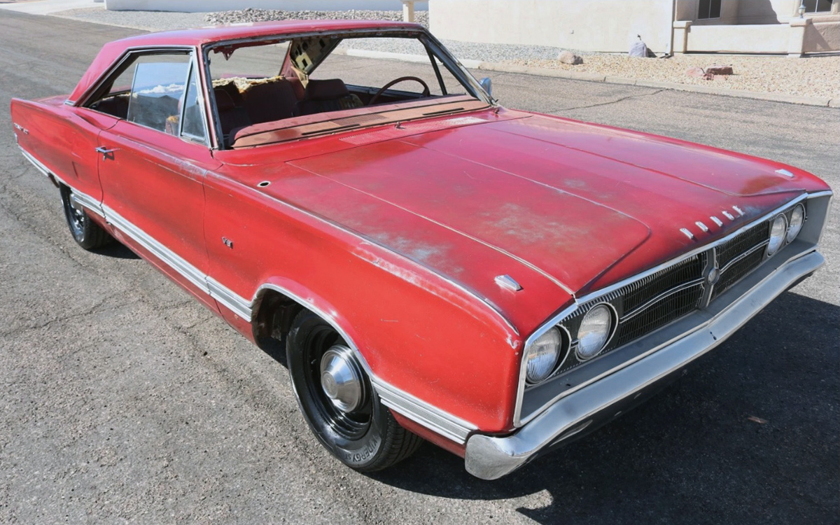 Despite its initial appeal as a practical but sporty alternative for families, the Coronet rapidly acquired the aura of a muscle car, with ever larger V8 engines available. These included the optional 426 cu. in. Hemi, installed in a very few examples. In 1967, the R/T was introduced, inheriting the performance mantle. This ’67 is powered by a 383 cu. in. V8, good for 270 hp with the factory-supplied two-barrel. The transmission is a three-speed automatic. The seller has performed considerable mechanical work in an attempt to resurrect the car, including a new fuel pump, starter, brakes, and tune-up components. The carburetor was also rebuilt and the wheels and tires are new. After all this, the car still won’t run, apparently because the fuel system is clotted with old gas.