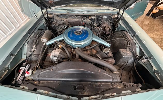 Aside from needing the seat backs installed (they come with the car), the interior appears to be in nice condition. Although the seller presents the car as having bucket seats, the “084” trim code suggests that it’s a bench-seat car with a folding armrest, which is seen here. The car is well-equipped, with power windows, AM/FM radio, power antenna, and air conditioning.
