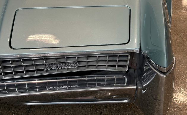 There are some flaws to note, the most concerning being a dinged bumper and grille, not the easiest parts to source. In this picture, you can see the pop-up headlamps, which are more smoothly integrated into the nose than they were in 1966 (which is a reason that some people prefer the 1967 model). Unfortunately, those pop-up headlamps aren’t working correctly, a common Toronado malady. The power rear-quarter windows are also down for the count.