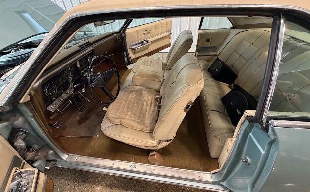 Aside from that, the Turquoise Frost paint has “imperfections commensurate with age” and the vinyl top is “weathered.” Some of this might sound a little bad, but it’s better to know the truth upfront than be surprised when the thing shows up on your front lawn. Nothing I’ve seen is particularly alarming if the car can be had for a reasonable price, and with about a week to go, you know I’ll be watching.
