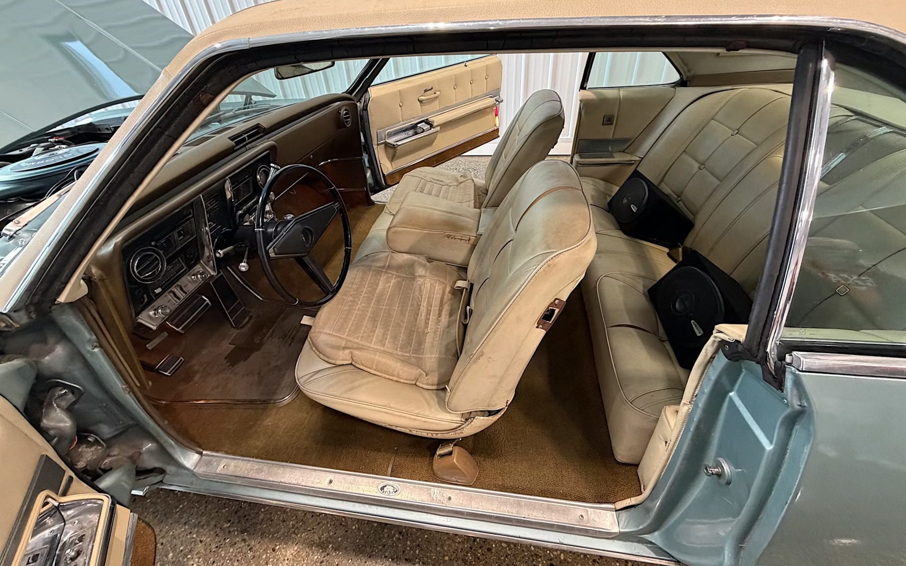 Something is not right with the trunk lid and it doesn’t look like an easy fix. The interior is tired and worn. I doubt there is a set of buckets seats which go with the car. The seat backs are missing from the bench seat. The rear seat’s stitching is starting to give up. Lots of little things as well. Of course there’s no reason to sweat the interior until the vinyl top is removed.