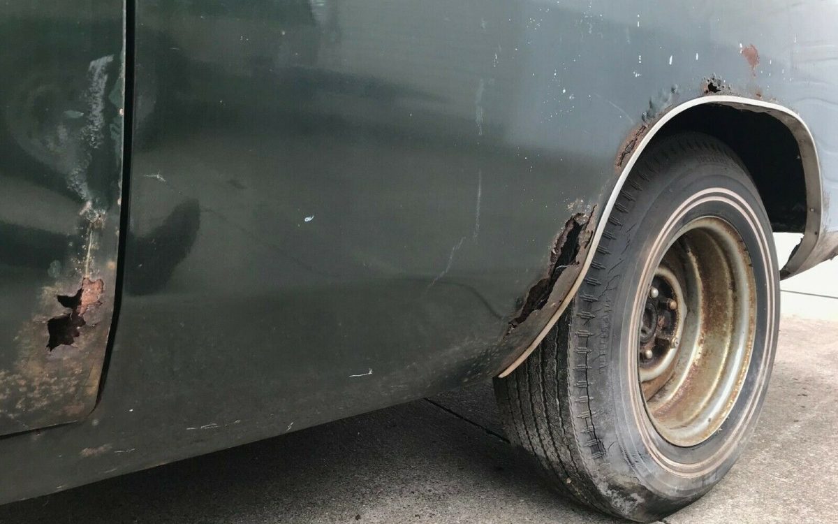As mentioned before, there is a bit to fix on this car. Mainly there is a ton of rust inside and out. You can see one of the quarter panels and doors here. There are also some detailed photos of the trunk lid/package tray, underneath, trunk floor, and passenger floor. You can get patch panels and replacement panels for any part of this car, but you’ll have to cut the rust back to good metal. It’s hard to tell just how much of the original car will be left, but since this is a numbers-matching 440 4-speed R/T, it probably warrants being saved.