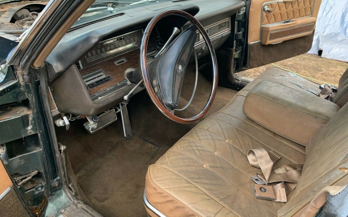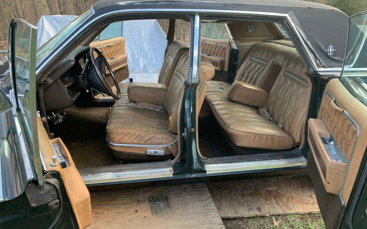 This car appears to be painted Grenoble Green, but the seller believes the car has received one poor repaint at some point. There’s no confirmation if the current color is actually a repaint, original, or even a color Lincoln offered in 1968. The body appears fairly straight, but there is rust in the rear quarters. Some lenses are missing and the vinyl top has seen better days. The seller tells us the floors and trunk are solid. I’d recommend a thorough inspection of the exterior condition, because replacement body panels are extremely expensive.