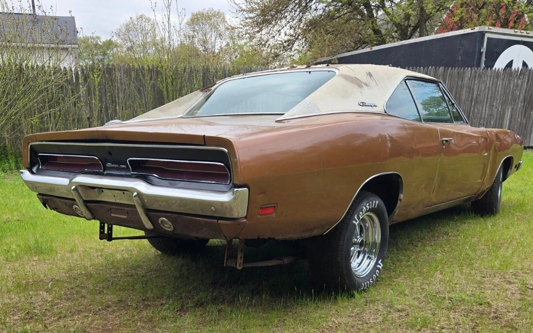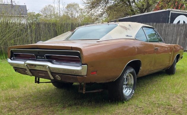 Forty-six years have elapsed since this Charger was operational, but it’s been sitting inside a garage that entire time, which has been kinder to the body than many late-sixties B-Body projects that show up in the marketplace. Granted, there’s some rust and a few panel repairs will be needed, but the area around the back window looks pretty good, which is unusual considering the vinyl top. A few exterior dents will also need to be straightened out, but overall, this doesn’t seem to be at all that bad of a starting point from the outside.