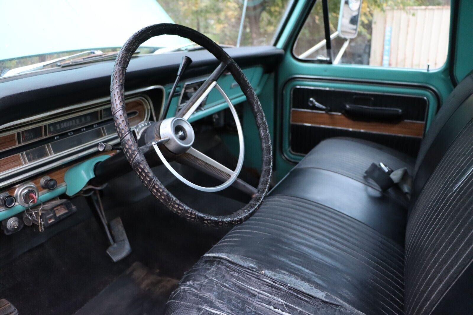 By the late 60’s, pickups were far from the utilitarian vehicles of the previous decade. Ford advertised their Ranger trim level as having “high-styled interiors with woodgrain inserts in the instrument cluster and door panels, bright-metal instrument panel molding, pleated vinyl door trim, and deep-foam seat cushions.” The driver’s seat cushion is definitely showing wear and the black leather wrapped steering wheel over could be masking cracks, but the dash is crack-free and, overall, the interior looks clean and in good shape.
