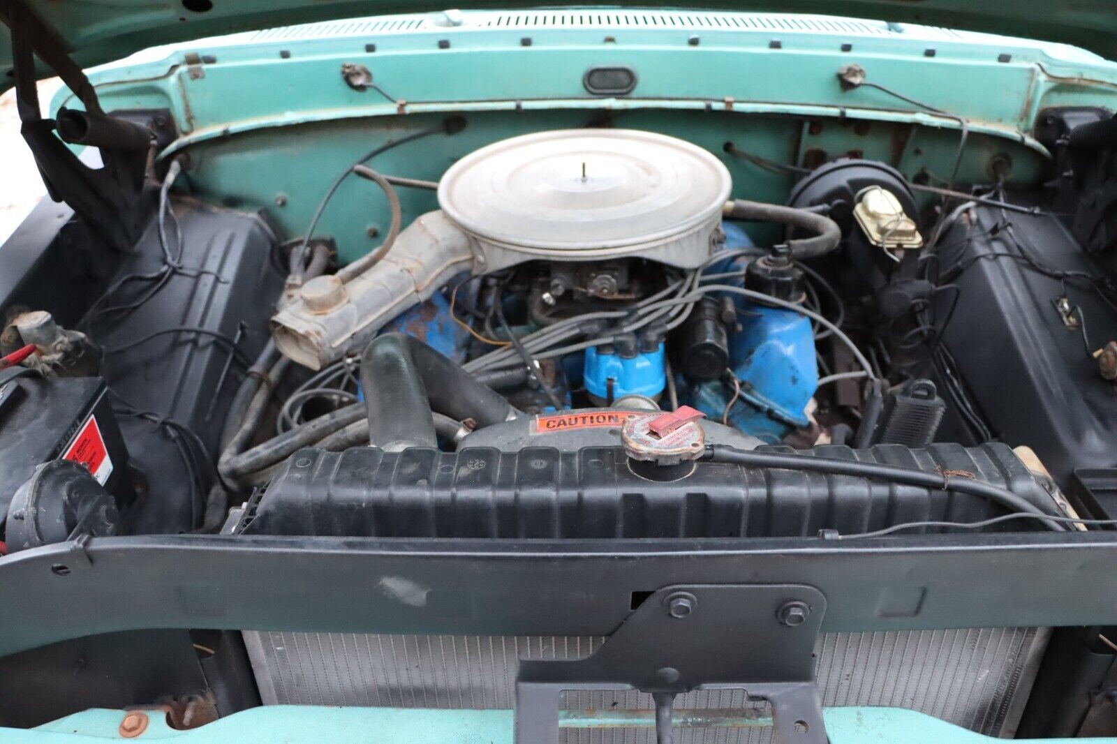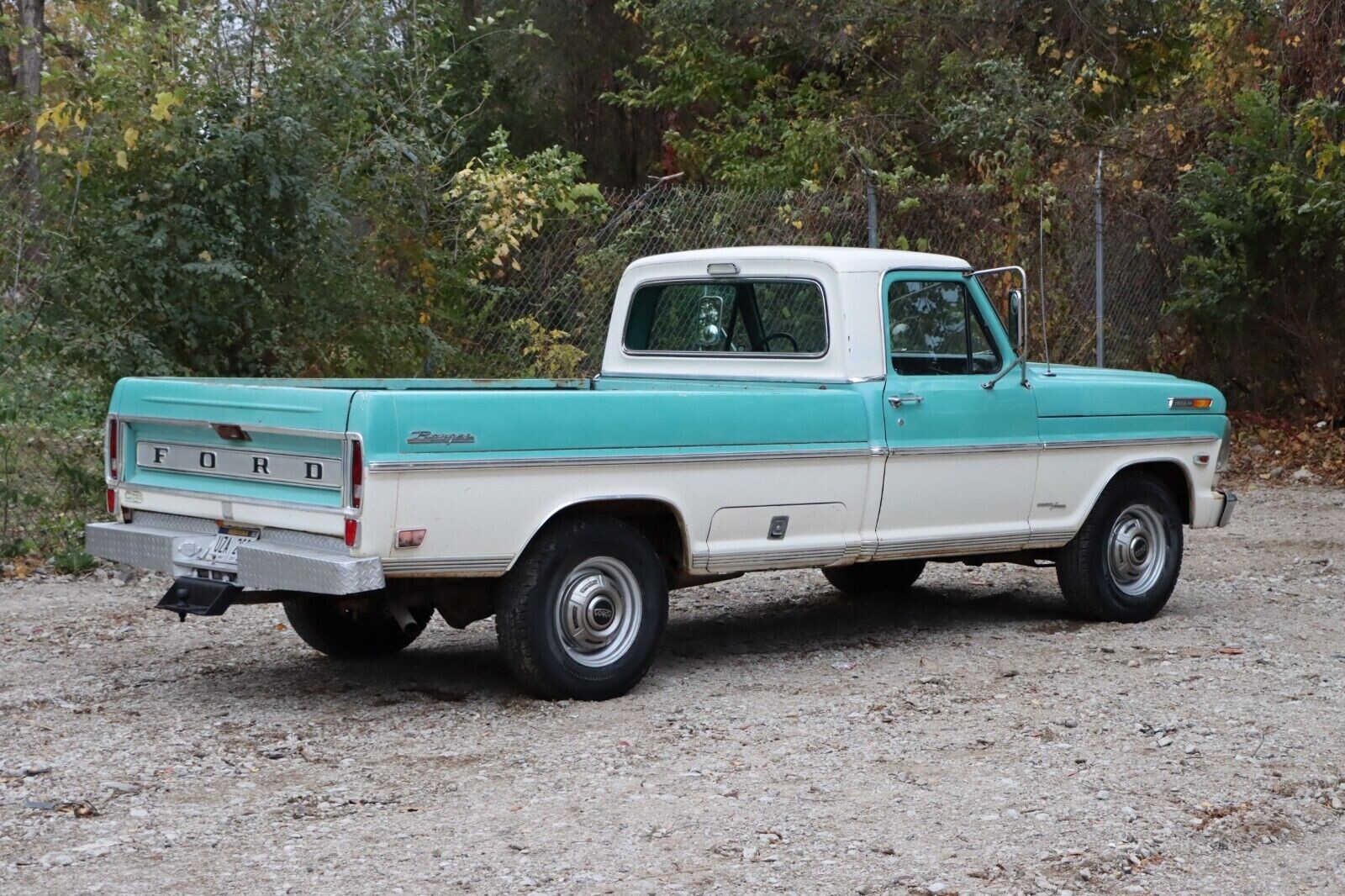 The seller is very scant on descriptions and the truck’s history and say’s “it’s definitely a barn find. Original parts,” but doesn’t go into details about those claims. Based on the photos, it looks like a good, solid, old unmolested truck. I’m not sure, but that could be the original two-tone paint (I believe it’s Caribbean Turquoise and Wimbledon White) and it looks presentable. You can spot some surface rust, chips, and other imperfections but nothing major. It has the tool stowage box for the 8-ft. Styleside and the western-type mirrors, and the Ranger-level trim looks good as does the glass, tires, and bumpers. The front grill is nice but the headlight surrounds have a Max Scherzer-effect as one surround is black and the other is a rust brown in color. There were no photos included of the pickup’s bed.