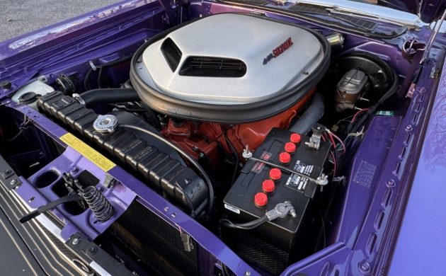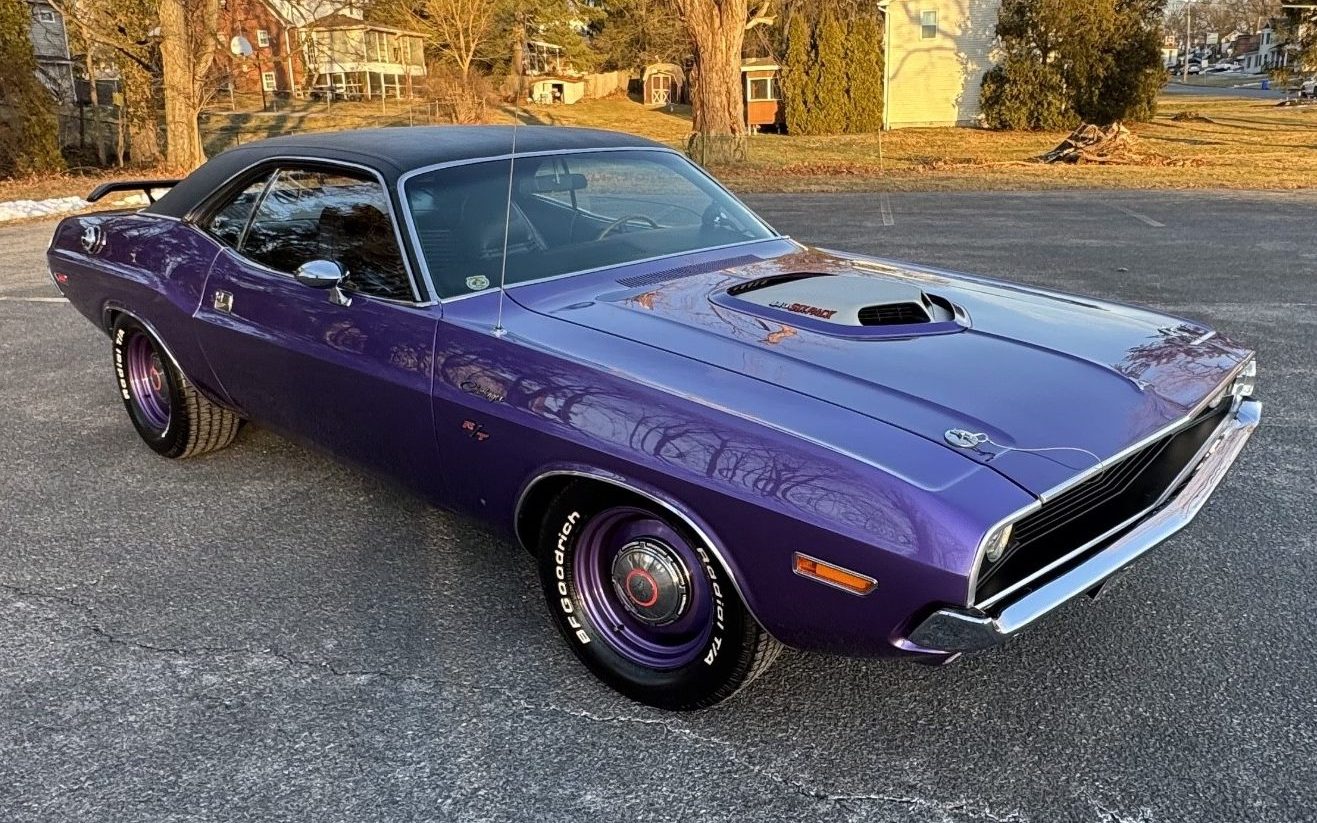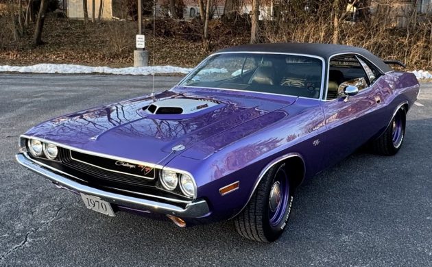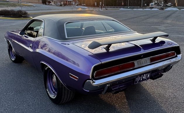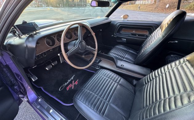 When Dodge unveiled the Challenger in 1970, it introduced what I believe to be one of the most attractive American cars of that decade. The styling was bold and purposeful, and even in its most conservative mechanical form, it couldn’t help but turn heads. This first-year Challenger R/T is a prime example of the breed. Finished in desirable Plum Crazy with a Black vinyl top, its appearance is first-rate. Although it received a complete restoration approximately twenty years ago, it has only clocked around 6,500 miles since then. Therefore, it hasn’t had much of a chance to accumulate chips and other imperfections. Upgrades during the build include the vinyl, rear spoiler, and hood shaker. The depth of color and shine is impressive; the panels are laser-straight, and the vinyl is in as-new condition. The seller supplies several underside shots, revealing floors that are almost as clean as the exterior. The trim and glass appear flawless, and the color-matched wide steelies with dog dish hubcaps emphasize the car’s purposeful appearance.