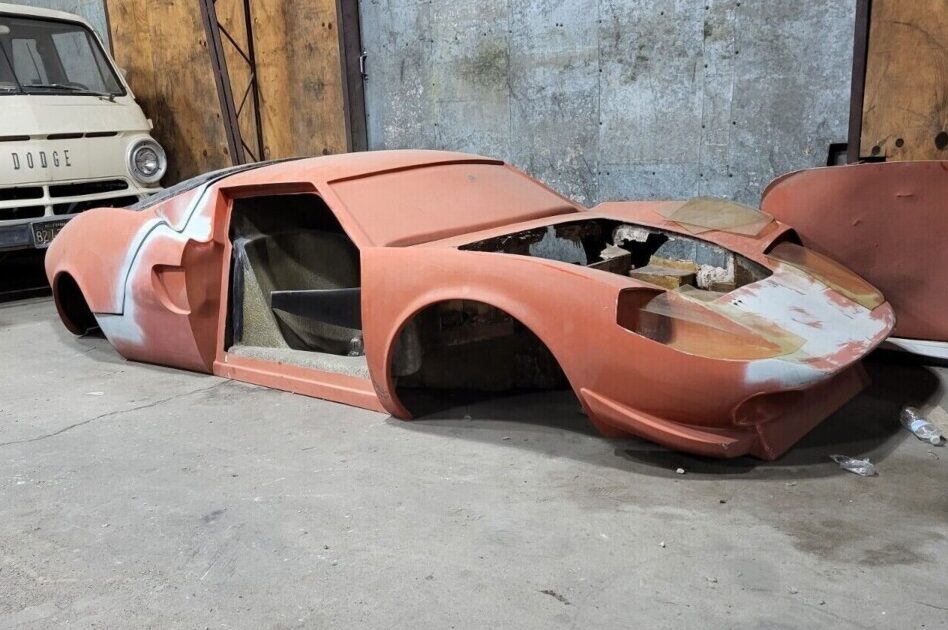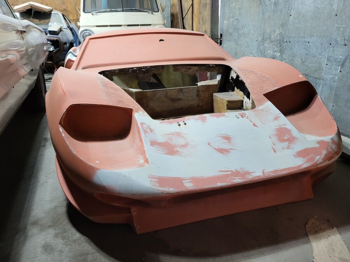 This is actually a really nice kit with all the hard to find goods like a full frame and converted transaxle – and rear louvers (!!). I even think I spy with my discerning eye the plexi headlight covers in one photo. …made of pure Unobtanium these days….. Most of these fiberfab GT-40 wannabees are gutless junk on flimsy VW pans, but this one built right could be a real beast with an actual correct tilt rear and less offensive rear wheel arch styling/proportions, not to mention a real and actual mid engine setup, not a flat 6 or 4 shoehorned under the rear bumper like the VW and Corvair based models – which necessitated elongating the rear quarters which made the car look stupidly out of proportion. But not this one… Would make an an ideal EV project for those interested in eyeball-flattening, filling-extracting acceleration… Someone will be getting a nice deal with the frame – which is very hard to find now. As mentioned, the door and rear glass is Mustang 2×2 fastback, the front glass is Corvair – back in the day those cars were on every street corner…. so easy to get. I’d buy this but I already have one I’m building as a mid engine example with custom built frame using 2 EV Coda motors and a slimmed down Tesla battery pack. Would have been easier to start with this, however.