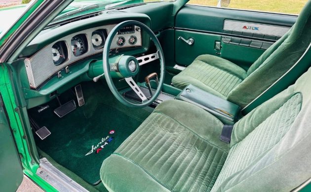 The theme of excellent presentation continues inside this Javelin. Trimmed in a combination of Green cloth and vinyl, there is no significant wear or deterioration. The seats look extremely nice, and the matching carpet is protected by a classy set of embroidered “Javelin” mats. There are no dash issues, and the only genuine cosmetic shortcoming is the split console lid. The seller added a pair of Stewart Warner gauges to monitor the V8’s water temperature and oil pressure, but the car retains its factory AM radio.