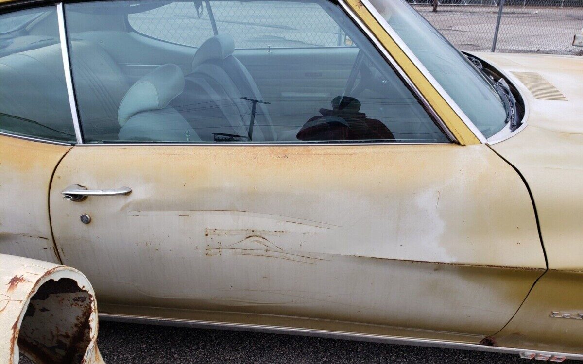 Wearing what was at one time known as Quezal Gold Metallic, and topped with a vinyl roof covering, this LeMans looks like it has had a trip to the blast furnace. There’s a mishmash of thin primer and surface rust evident everywhere. Look close enough and you’ll note various scrapes, creases, and other contusions though I wouldn’t rate any as serious. For real rust? Yup, there’s some of that too in the lower passenger-side fender leg. The seller states, “The car is from Nevada so it is pretty solid (currently in Bowling Green, KY). The only rust-thru I see is on the passenger side front fender“. Rust is the nemesis of this generation of GM’s A-body so a peek underneath would be warranted – no real reason to suspect a major problem, however.