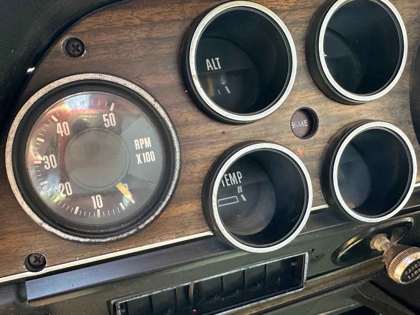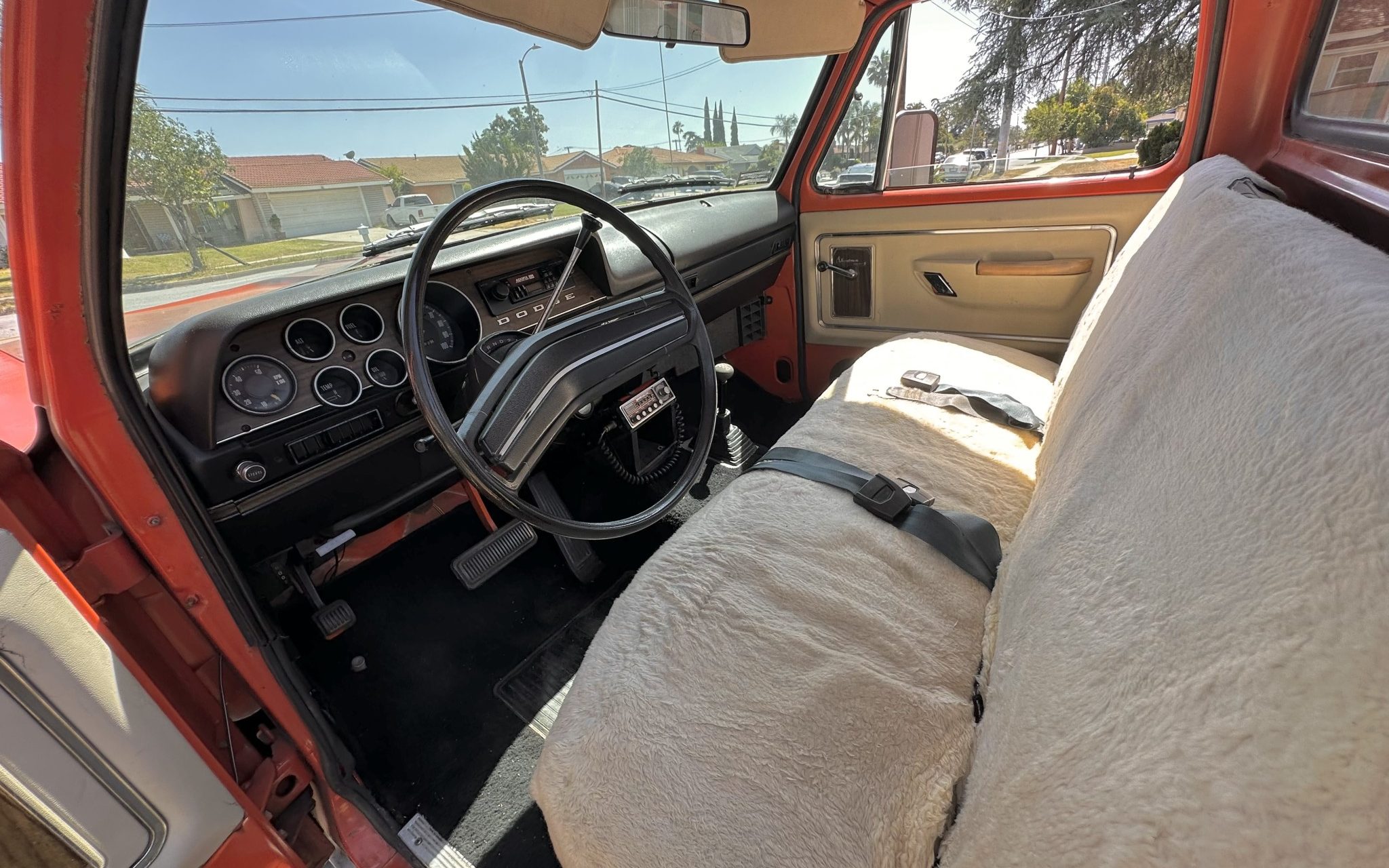 This truck is an “Adventurer Sport,” based on the advertisement and the badging, and that was really an exterior AND interior combination. The Adventurer exterior gave the buyer some extra bright trim, while the Adventurer Sport interior gave you built-in armrests, a “foam core headliner,” a woodgrain instrument panel, and a factory tachometer in the case of this truck, among other convenience and appearance items. The beige bench seat beneath the seat cover is still intact but has a few tears, as one might expect from an original truck.