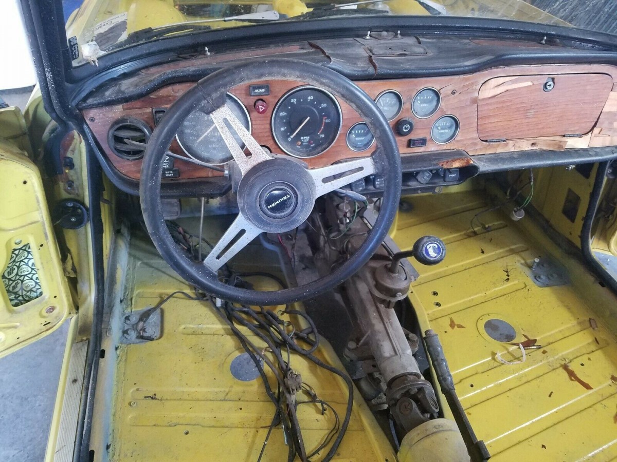 The seller is letting this 1973 Triumph TR6 go due to a divorce. The car has been stored since 1993 and the current owner bought it 3 years ago. It can be seen here on eBay and is located in Angier, North Carolina. There are 2 days left in the auction and the car is bid to $2,950. Featured in yellow with a black interior, this Triumph looks like a solid starting place for a project.