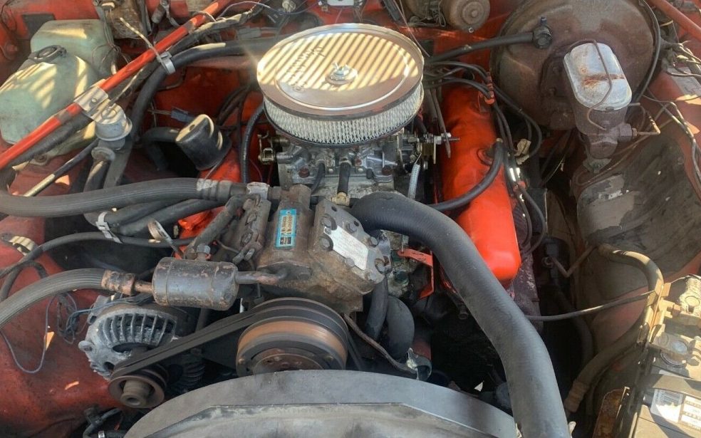 The interior, other than the shredded driver’s seat is in fair shape. The upholstery would be considered parchment, one of five colors offered in ’76 and it’s not as yellowed as one would think. The carpet is a bit rough looking but the rest of the environment is OK. Considering the noted body rust, it might be wise for prospective buyers to check the underside/floors.