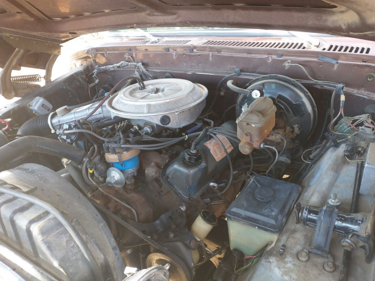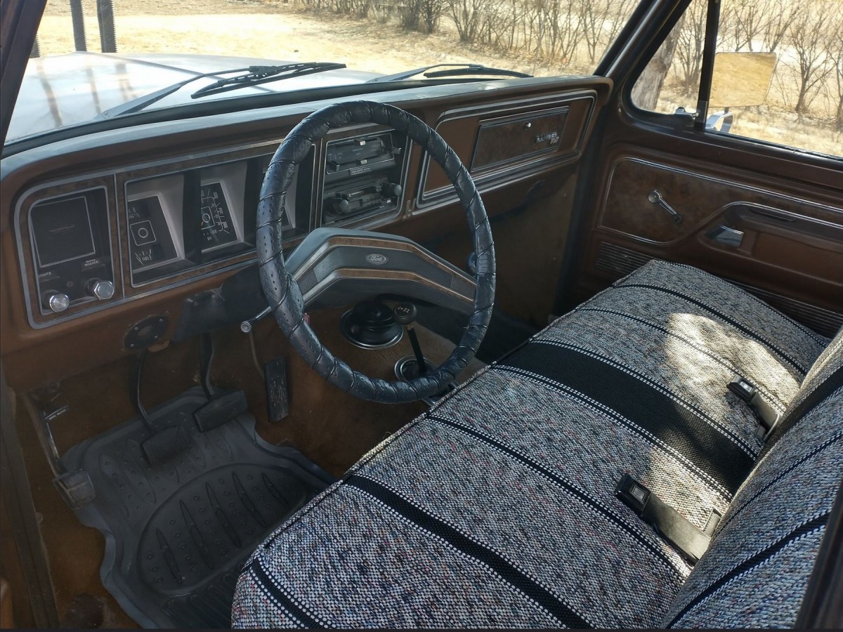 When you open the doors and take a look around inside this F250, you learn pretty quickly that this is no trailer queen. Under the saddle blanket cover, the original seat upholstery is shredded. It is possible to buy a replacement, but I admit that I quite like the cover. The carpet is badly worn, and if a restoration is being considered, this would need to be replaced. The pad is cracked, but the rest of the dash looks good. The door pockets have begun to sag, but some new elastic would soon fix that. The rest of the trim seems fine, except for the bullet hole in the driver’s door trim. I wouldn’t touch that because it is quite a conversation starter. There aren’t many luxury extras, but the F250 does come with a sliding rear window and an aftermarket radio/cassette player.