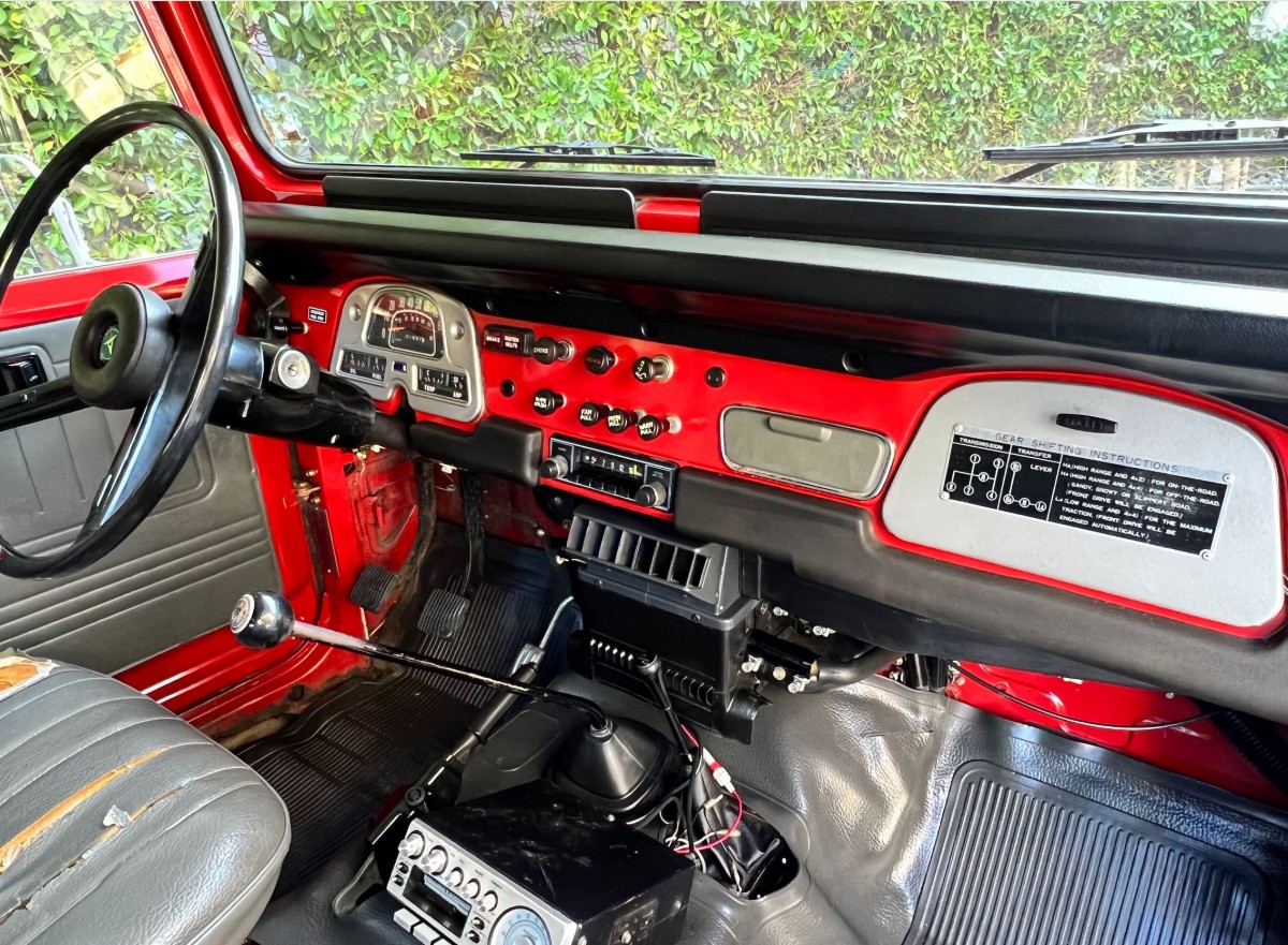 This Land Cruiser is an unrestored classic. Its Freeborn Red paint is original and untouched, while the stripes are a dealer-applied option that the original owner had installed before he drove it off the showroom floor. The paint shines impressively for its age, although it has accumulated a collection of scratches typical for an off-roader of this age. The panels are surprisingly straight, and nobody has ever removed the top. The original owner upgraded the front bumper to accommodate a winch, but apart from that and the larger wheels, the exterior remains unmolested. There is no visible rust, but that doesn’t mean that the Cruiser is rust-free. While the frame is rock-solid, there is rust in the driver’s side front floor and some in the rear floor. Replacement steel for these areas is readily available. Since the seller recommends that the buyer replace these sections entirely, that represents one of the few financial outlays the buyer will face with this classic. The glass appears flawless, and the overall first impression is quite positive.