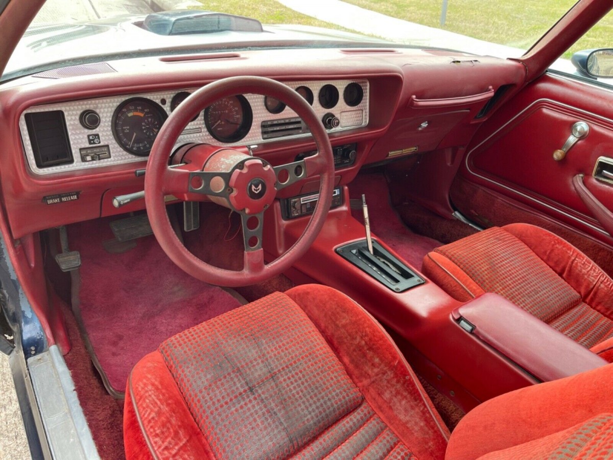 The interior is worn but represents the optional deluxe interior that could be ordered with cloth hobnail seats the custom door panels. The car has tilt steering, automatic transmission, T-Tops and what looks like an aftermarket stereo and tape deck. The shifter knob is missing and the red seats are heavily worn. The dash is cracked which is going to cost about $1,000 to repair if you pull it out and ship it off to Al Knoch Interiors or Just Dashes.