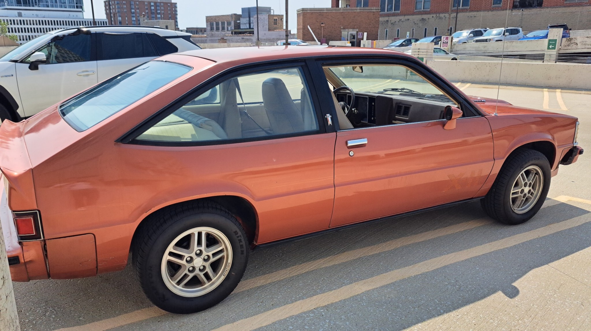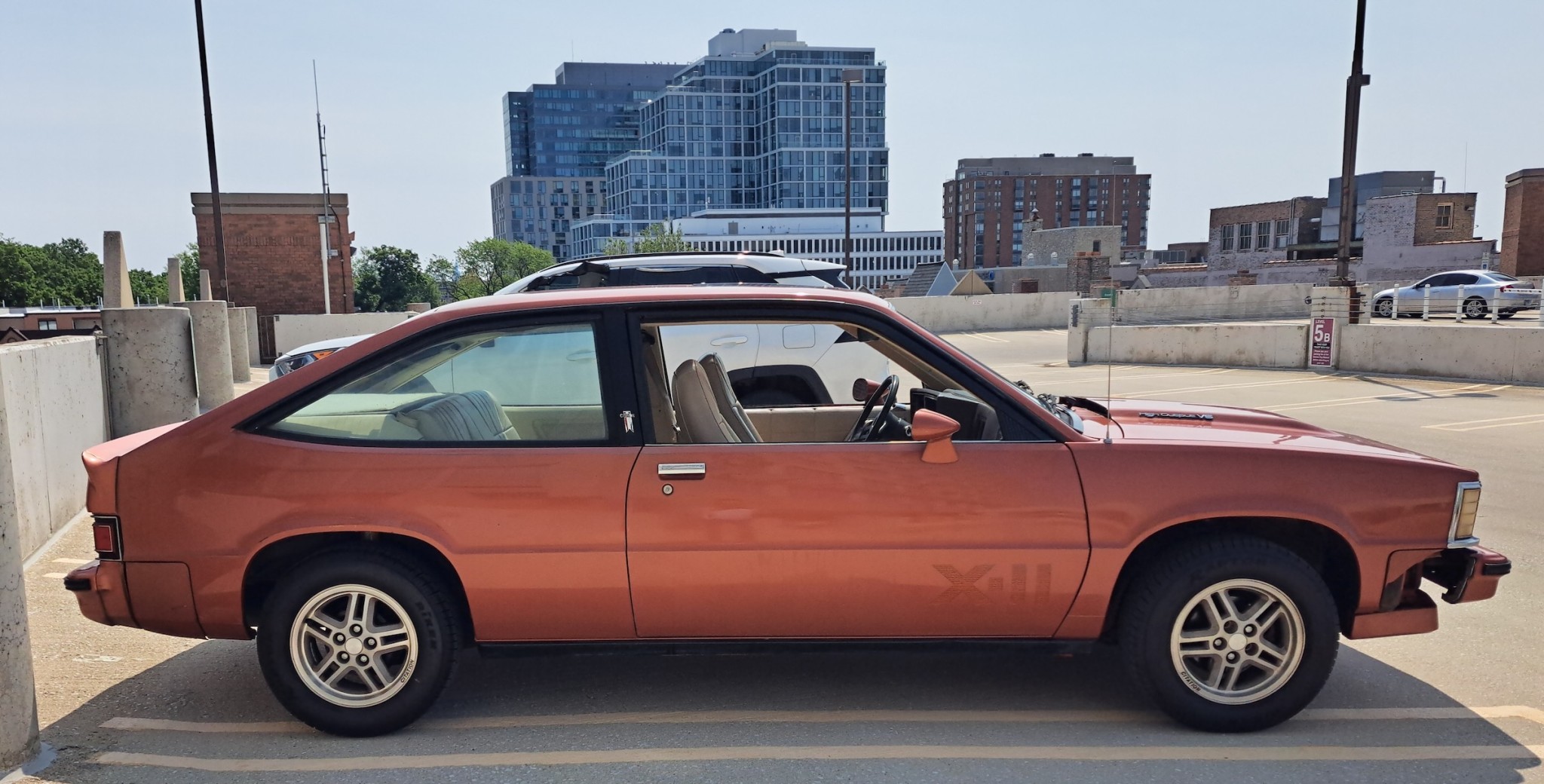 They had a nice amount of room inside, and this car has vinyl seats, but cloth was another option. The X-11 came in this two-door hatchback body style and a two-door notchback, which is pretty rare to see today. A variety of hatchback/notchback styles with either two doors or four were available in the general lineup throughout its run. Make mine a notchback with a trunk every time, but a hatchback has some nice utility that can’t be found in a car with a trunk. This car also has an optional sunroof, by the way.