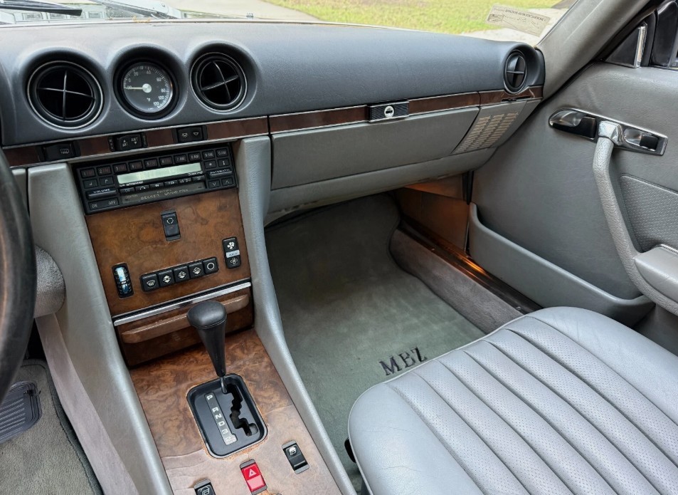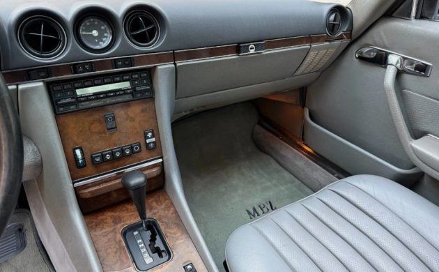 Upholstered in grey MB-Tex – the company’s durable, attractive leather alternative – the interior appears almost new. The wood trimmed console, normally vulnerable to cracking and loss of finish, is in fine shape. The carpets have been cleaned for its photo shoot, and the hardtop is nearly perfect. We wish we could see the soft top, but with 100% positive feedback and a specialty in Mercedes cars, this seller is very likely to respond quickly if a prospective buyer wants more photos.