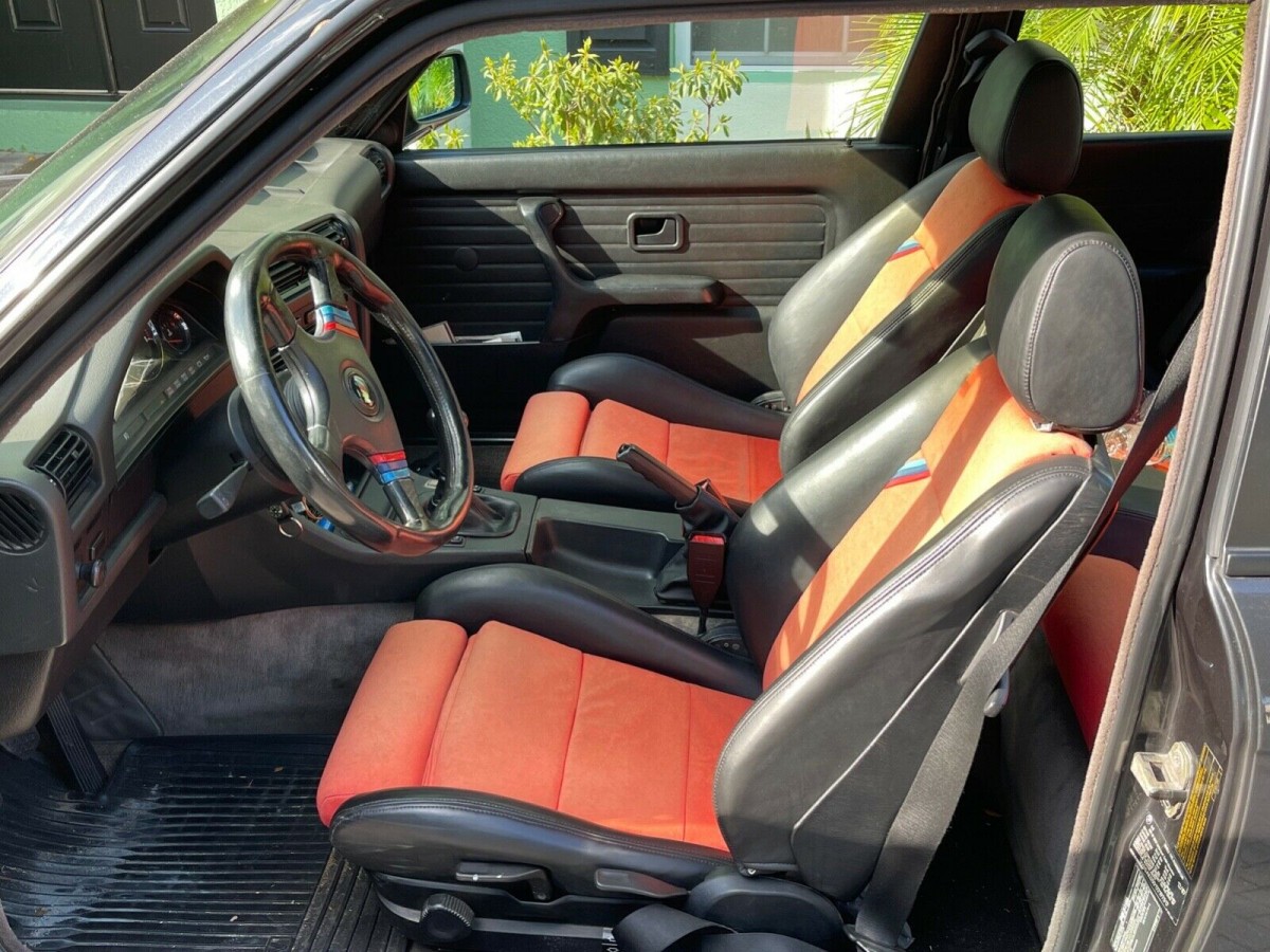 The interior has also been “improved” in a way that likely wouldn’t pass muster today. The two-tone look is easy to achieve given the construction of the BMW sport seats, which feature a center cushion and two side bolsters on each seat. The fact that a previous owner decided to re-do the stock black leather with this slightly garish red insert is another hallmark of 80s and 90s modifications, and while I’m sure it was expensive, I’d rip it all out if it were mine. The custom work carries into the backseat, but the carpeting remains black, thankfully. The door panels are stock E30 components and look to be in good shape, but the steering wheel is a garish aftermarket replacement.