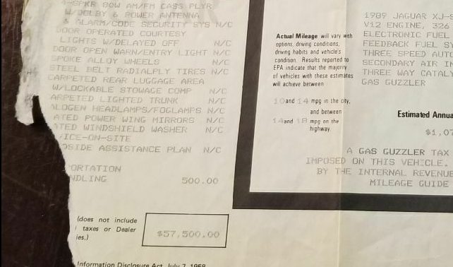 Here’s a small portion of the original window sticker for this car. Two important points: 1) $57,500 to <$1,000 is colossal depreciation. This was a really, really nice car when new and the price reflected that. 2) That gas guzzler tax — it’s well-deserved! Let us know if you’re interested in this bargain V-12 convertible and better yet, if you buy it yourself!