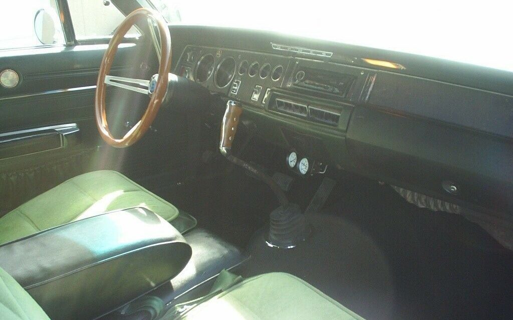 Most of the green interior is original and it still shows well. The upholstery, carpet, dash, instrument panel don’t reveal any obvious flaws though the front seats appear to be wearing covers and they don’t match the back seat. The steering wheel has been replaced with a nice looking aftermarket wooden piece and some under dash engine gauges have been added. Everything else is said to work as intended.