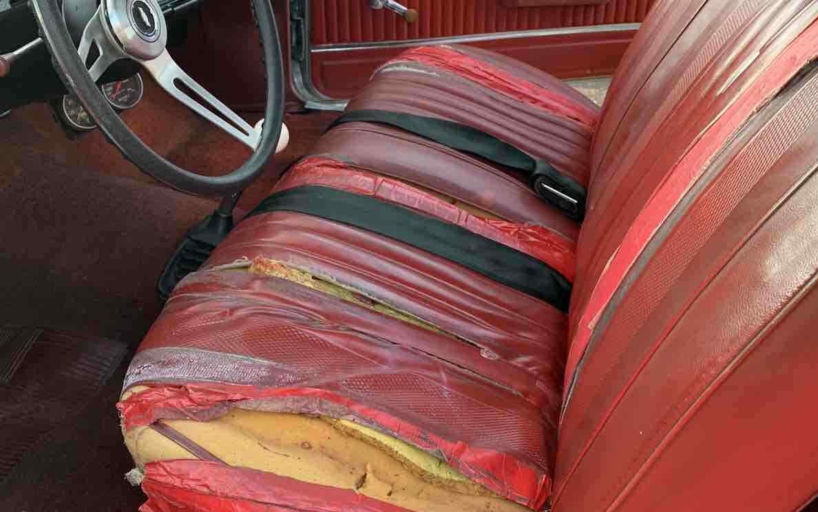 As sharp as the exterior is, the interior is not quite up to snuff, the offending item being the front seat. There must be an ongoing sale on red duct tape that I don’t know about because this is the second car that I have encountered this week that is slathered with the stuff. Beyond that, the headliner is missing but the rest of the interior checks out pretty well. The red carpet is faded, nothing unusual about that and the front seat can obviously be fixed but its atrocious condition really detracts from an otherwise, sharp, overall presentation. The headliner is another matter, a correct one is a tedious, expensive item to replace in this vintage Chevy. Obviously, it’s not necessary but if a potential new owner wants a more finished off environment, it will be something to consider. As expected, the instrument panel houses a typical Malibu horizontal speedometer. While the bench seat is standard for a Malibu, it was also standard for an SS model in ’70 (and the bench seat with manual four-speed shifter is a neat combination!). Bucket seats and a center console were standard on a ’64 & ’65 Malibu SS, but when that model morphed into the SS 396 in ’66, the buckets/console combo became an option and remained that way through ’72.