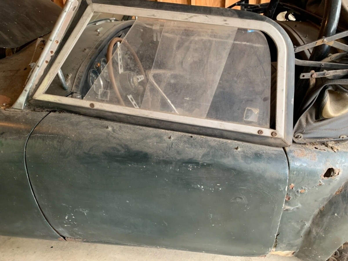 You may wonder why the doors haven’t rusted like the fenders right next to them. That’s because they, along with the hood and trunk lid, are aluminum skinned (over steel frames). The side curtains look intact and the car looks relatively complete from what I can see.