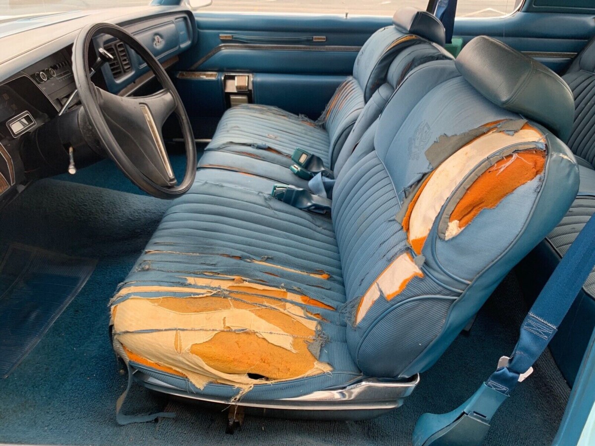 The front seat is in sad shape with the original plush blue cloth and vinyl upholstery showing lots of rips and tears. The top of the back seats show damage as well, so based on this and the condition of the vinyl top, the car appears to have spent some time outdoors in the California sun. No photo is shown, but the seller says the middle of the headliner has “rips and tears” as well. The door panels look very good though, and the original blue carpet isn’t bad but it is faded in areas. The seller also shares that the two front power windows and the gas gauge are not currently working.