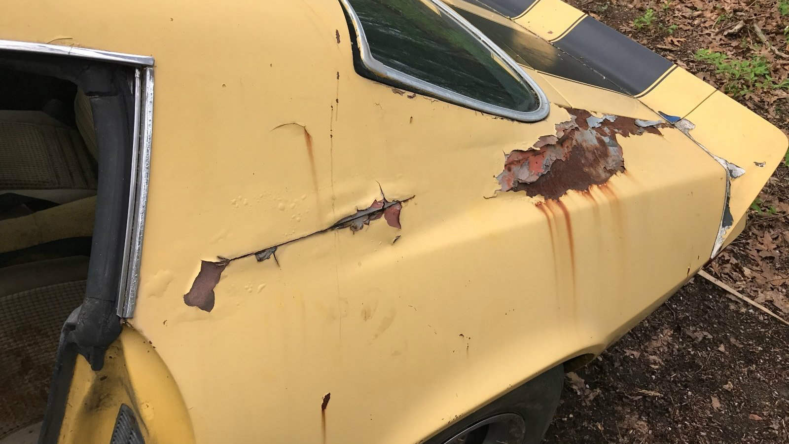 Am I right in thinking this quarter may have been replaced before due to where the rust is breaking out? It sure looks like there is some body filler where it would have been used to cover a seam. The car does come with a new pair of quarter panel skins, so perhaps the repairs could be redone?