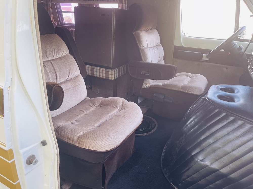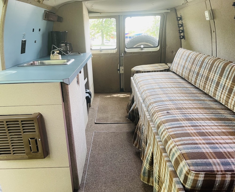 Falling into that category is particularly disastrous for an RV, as any water that sneaks past the roofline inevitably trickles into passenger compartments like these, warping fake wood trim, staining upholstery, and leading to unsightly (and unhealthy) mold build-up. Not so here, as the Dodge retains all of its period details from the countertops to the couch cushions. The plaid upholstery is totally correct for a motorhome of this vintage, and it’s incredible to see one that is either completely unmodified or has lovingly been restored back to factory condition. The Dodge is equipped with a kitchen counter and sink, along with a mini-fridge.