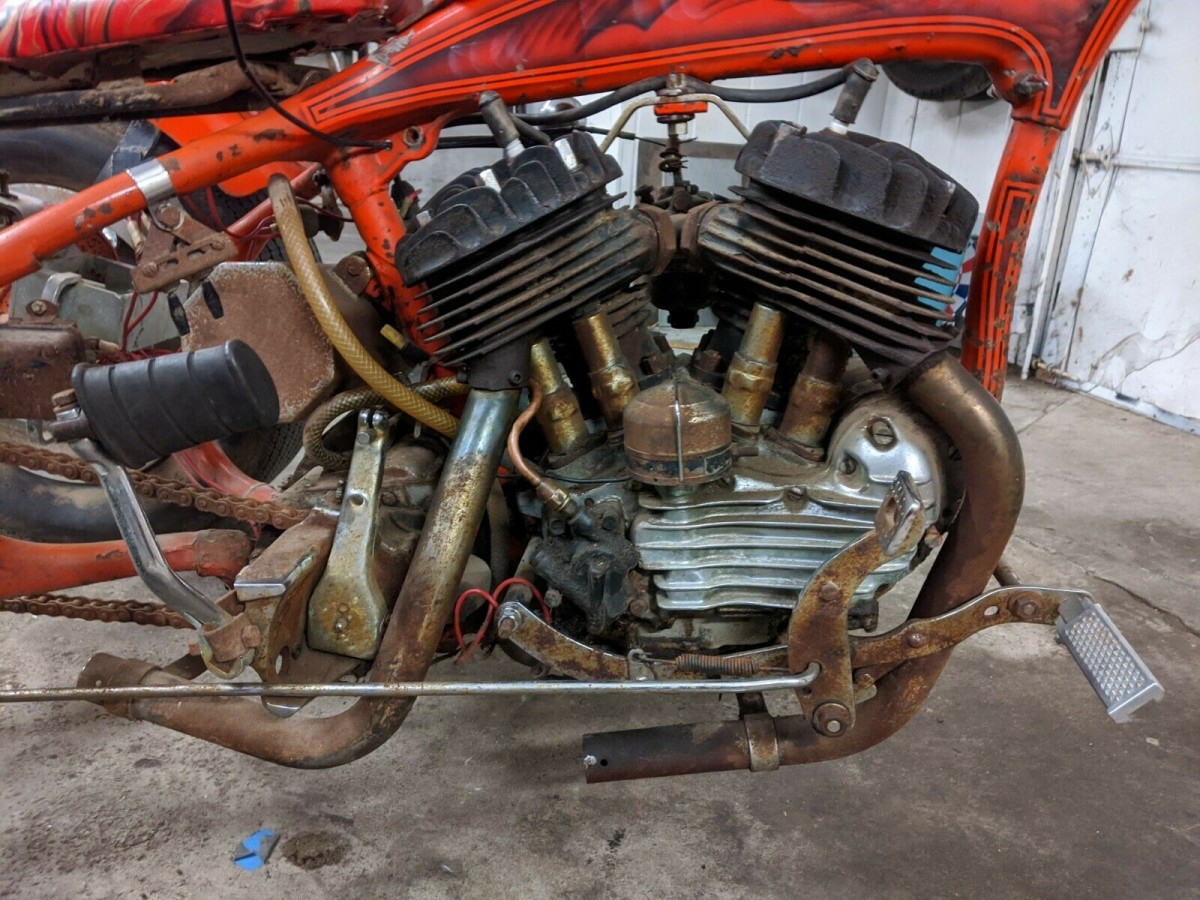 The seller notes that the engine moves but the valves are stuck – as a bonus, it retains the original cylinders and heads. The tank will also need to be cleaned out, so it has the usual pitfalls of long-term storage. The good news is it comes with a load of new and aftermarket parts (but doesn’t specify which are new), including a Linkert carb with velocity stack; OEM distributor; OEM chrome clutch foot control with Suicide shifter; OEM chrome octagon style oil tank; and more. The paint is custom and hasn’t been touched since the 1970s, which isn’t a bad thing for a period custom like this. Would you preserve the chopper build or recreate the original Servicar setup?