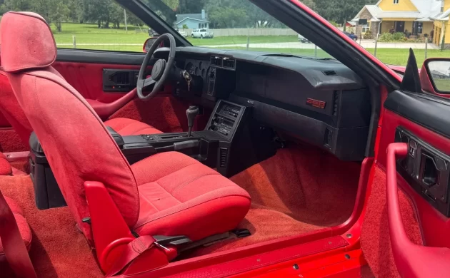 Inside, it doesn’t get much more 80s than this. The all-red interior, down to the carpets, the door panels, and the seat trim, is just fantastic. If you want a vehicle that screams Americana and is peak 1980s, this is your ride. Oftentimes when you step into a convertible, you see the ravages of years left with the top down in the form of faded upholstery and cracked trim. In the case of this Camaro, the dash pad is cracked but the cloth seating surfaces and carpeting actually look pretty fresh. The dash pad is an easy part to source from any number of Camaro parts suppliers, so I wouldn’t worry much about replacing that.