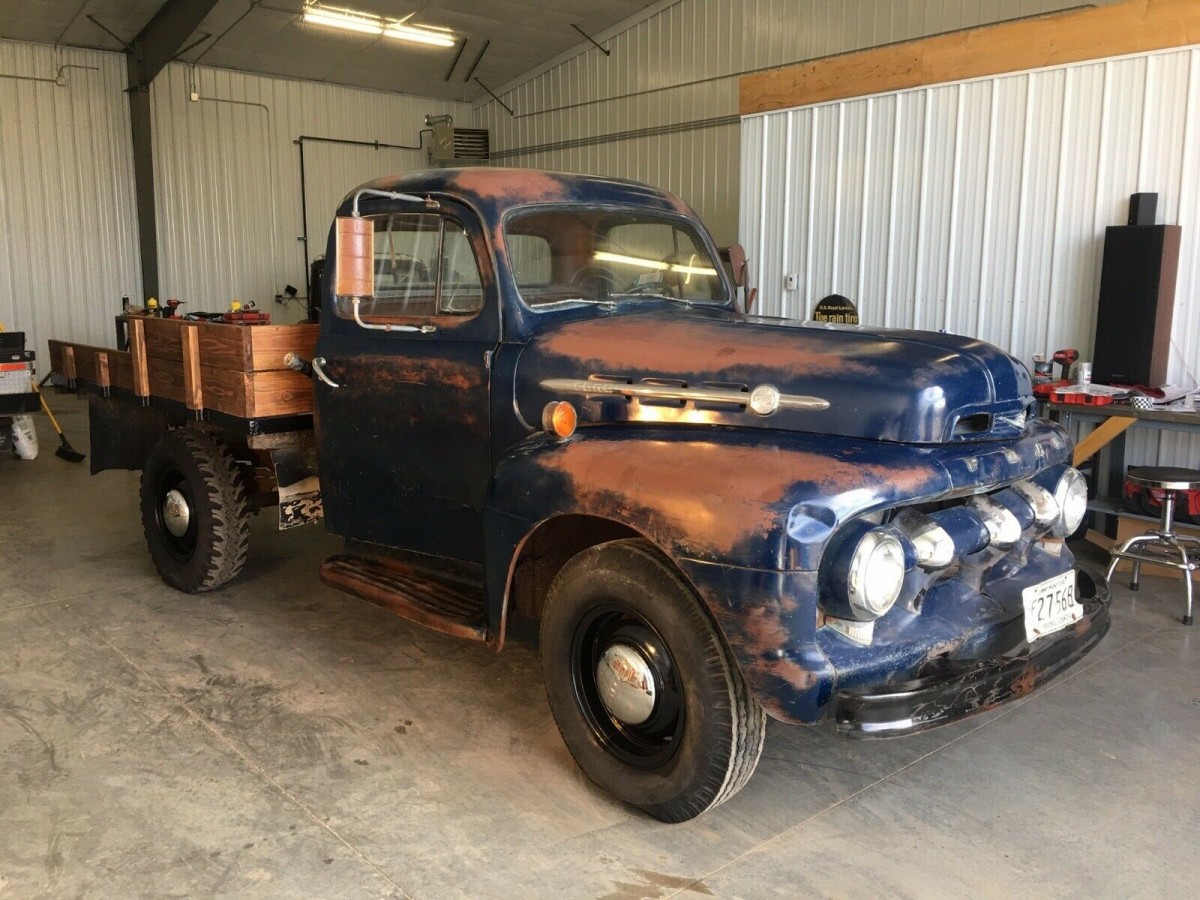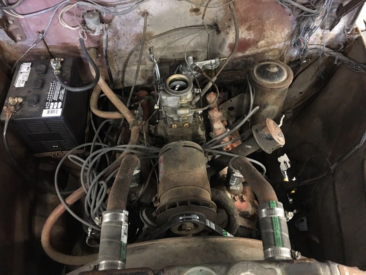 The memories keep coming back. When I was a kid these were thicker than flies on a dead horse, especially the ’48 to ’50 models. Very few flatbeds; mostly pickup bodies with hoists, and that hole cut in the tailgate to let grain out (destroyed a lot of tailgates). I’d actually prefer a pickup box to the flatbed, and on this one, finding a box might be a challenge because most of these were well used. There are still some around that might be willing to give up the box. Truck is in good shape otherwise. I think the floor in my ’47 was in worse shape than this one (they get rusted out because of moisture getting between the mat and the floor). Other than that, the cab looks like some minor dent repairs and a nice single stage repaint. A lot of blue trucks in that era although I think the forest green was still dominant. I’m wondering if the engine is the original; According to my sources red was the correct engine color for the 8BA in the trucks. I was told (recently) that Canadian truck engines were a shade of green. Of course, after 67 years, it could’ve been repainted during an overhaul so who knows?