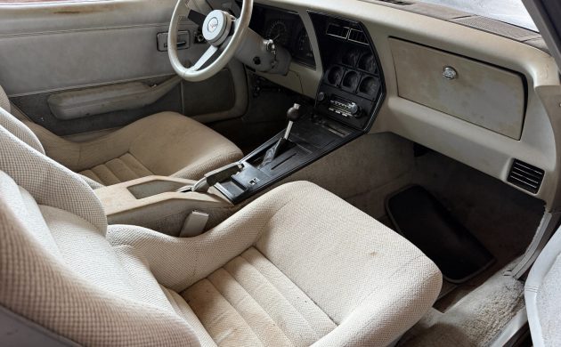 Chevrolet’s strategy to recapture some of the C3’s former glory hides under the hood. The company equipped the car’s 350ci V8 with Cross-Fire Injection, boosting power and torque from 190hp and 280 ft/lbs in 1981 to 200hp and 285 ft/lbs for the C3’s final production year. Okay, that didn’t make this a fire-breathing monster, but any gains are better than none. Another upgrade for 1982 was the four-speed 700-R4 automatic transmission, replacing the bulletproof but aging three-speed Turbo Hydramatic. The four-speed improved acceleration and open-road cruising, but was not considered as robust as the unit it replaced. The relatively short working life means that this C3 has only clocked 57,046 miles. However, the long-term storage means that there may be work required before the small-block roars back to life. Many perishable items will undoubtedly require replacement, but the winning bidder could undertake many tasks required to return the car to a roadworthy state in a home workshop.