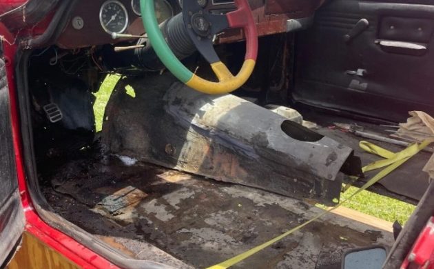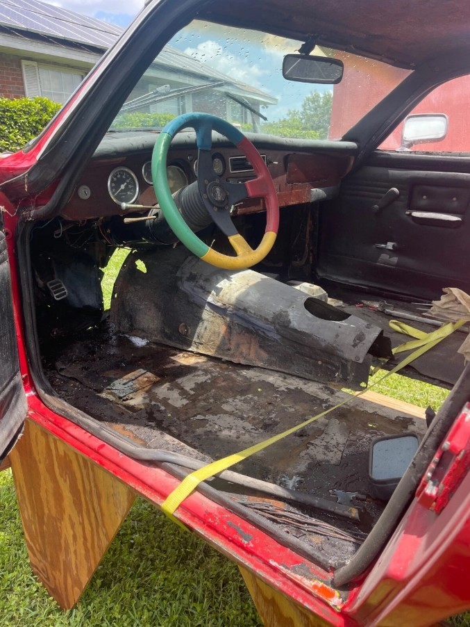 As stated, this Jamaican features no mechanical components, although it was originally pure Triumph TR4. The interior is a bare-bones affair, featuring a dash, some gauges, door trims, a tilt column, and a rather gaudy sports wheel. Whether the door trims could be salvaged is unclear, but the buyer will need to assemble a long shopping list before the vehicle returns to the road. Seats shouldn’t be a problem, because aftermarket items would work well. The biggest challenge could be carpet, because I wasn’t able to locate any during an admittedly brief online search. Having a custom set cut and stitched might be the only solution.
