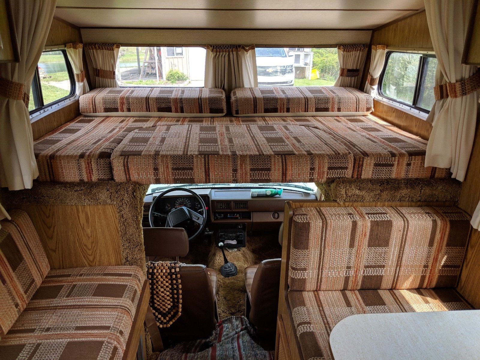 This RV will sleep, 5 to 6 adults. The settee table drops down when the support leg is folded up under the table and the locking mechanism at the wall releases when the table is lifted from the leg support area. It then drops down guided by a type of U bracket mounted to the underside of the table and the wall onto cleating mounted on the top edge of the seating not seen in photos as they are covered by the bottom cushions. The seating cushions slide down from each side over the table that becomes the support for a bed. depending on the size of the settee it will sleep one or two adults. The adjacent couch also becomes a bed that will sleep, two adults. The 20 R engine can be hopped up with just a weber carburetor and header giving much more horsepower. All recreation motor coaches are wind resistant including those of today. Gas mileage of any RV coach is not of concern as none get better gas mileage than this one would even with today’s vehicles fuel injection and computer regulated systems. In fact todays RV coaches loose millage due to todays required components that prevent pollution such as Cadillac converters and EGR pumps if equipped. I would have to say this is a nice find indeed given the cost of a new coach of today and the overwhelming cost to have one repaired compared to this older simpler vehicle. Often the basics of technology outway the cost of today’s coaches to purchase and maintain. Of course, this is just the opinion of one reader that knows first-hand what a weber carb and header can do for the horsepower of this engine.