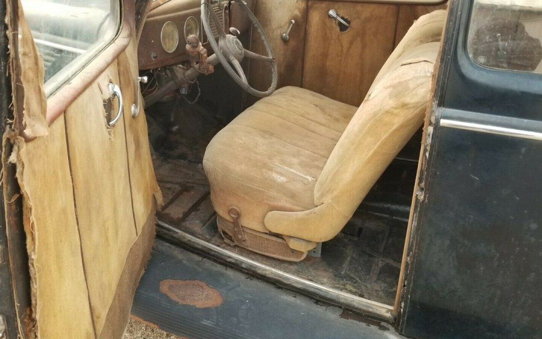 The paint is believed to be original and it looks like the typical oxidization found on a finish that is past the three-quarters of a century mark. There are numerous splotches of surface rust showing through too. The trim is still in place and looking OK but the bumpers could stand a replate. While there is no evidence of serious body damage, there are a few dents here and there. Other than the trunk floor, which needs attention, rust-through would not seem to be a problem with this Ford. The seller states that the car has always been kept inside but that seems doubtful – it doesn’t look like it and 82 years is a long time to account for a car’s every whereabouts.